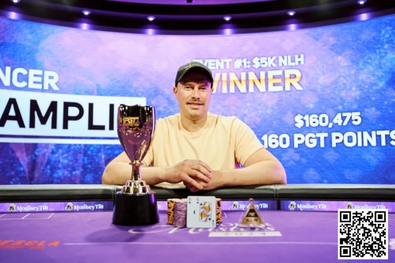Spencer Champlin原本是一名会计,他在八年前辞掉工作继而专职打牌。Champlin在这次扑克大师赛里,先是在一场买入560美刀的卫星赛中获得了比赛资格,然后在赛事#1(Poker Masters #1 – $5,100 No-Limit Hold’em)中,从131人中脱颖而出获得冠军。该比赛奖池为$655,000,奖励圈为19人,冠军奖金为$160,475。
